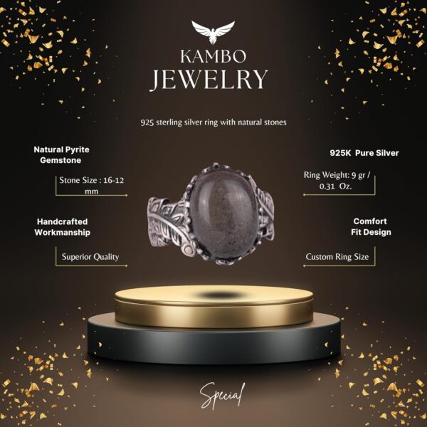 Pirit, koruma, bolluk ve güven ile ilişkilendirilmesiyle bilinir; bu da bu yüzüğü yalnızca dikkat çekici bir aksesuar değil, aynı zamanda dayanıklılık ve refahın anlamlı bir sembolü haline getirir. Vintage tasarım, el yapımı, eşsiz takıları sevenler için mükemmel bir sanatsal dokunuş ekler.