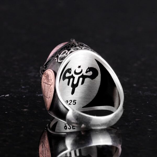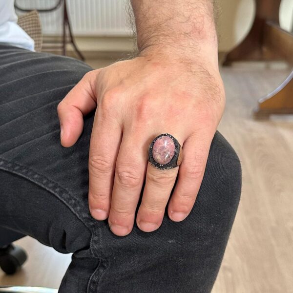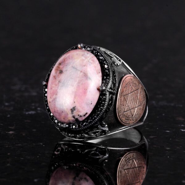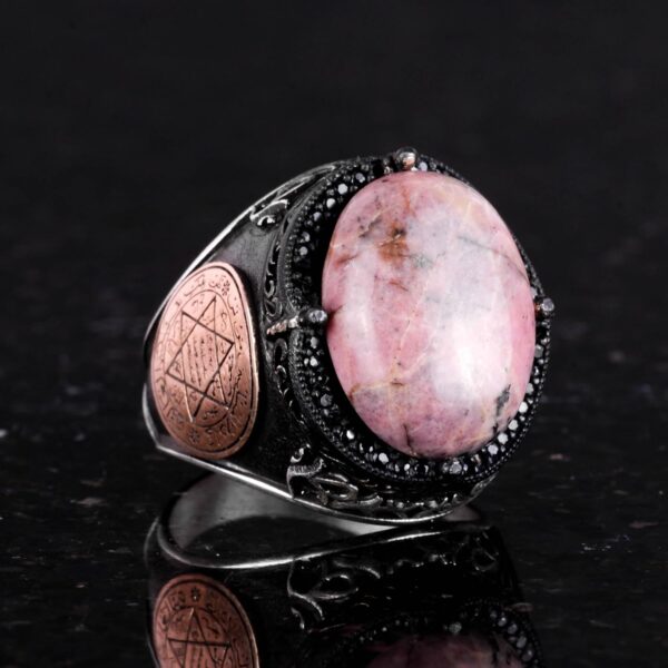 Gerçek Doğal Rhodonit Taş Yüzüğü, Süleyman’ın Gümüş Mührü Yüzüğü, 925 Ayar Sertifikalı Gümüş Erkek Yüzüğü