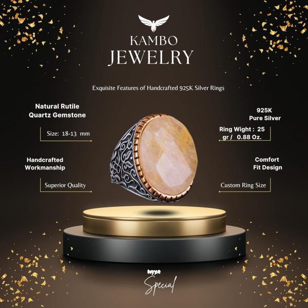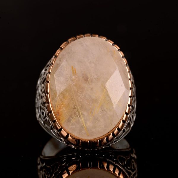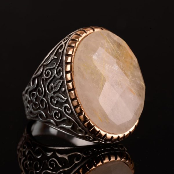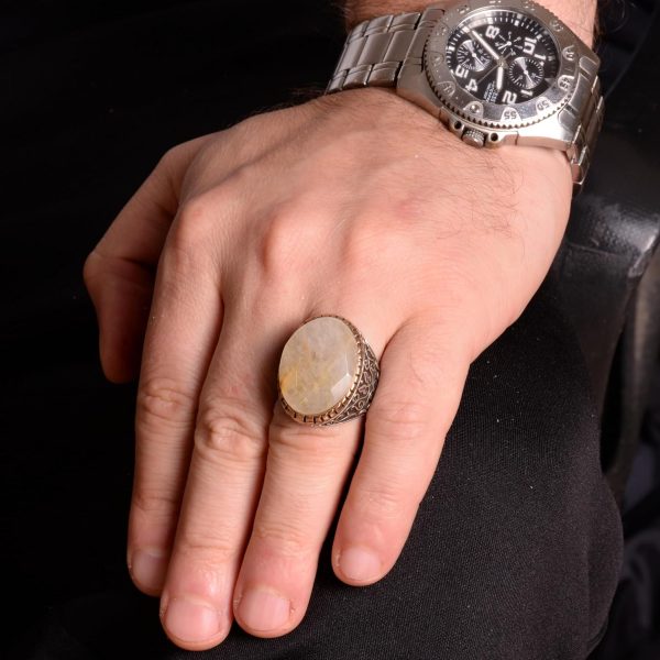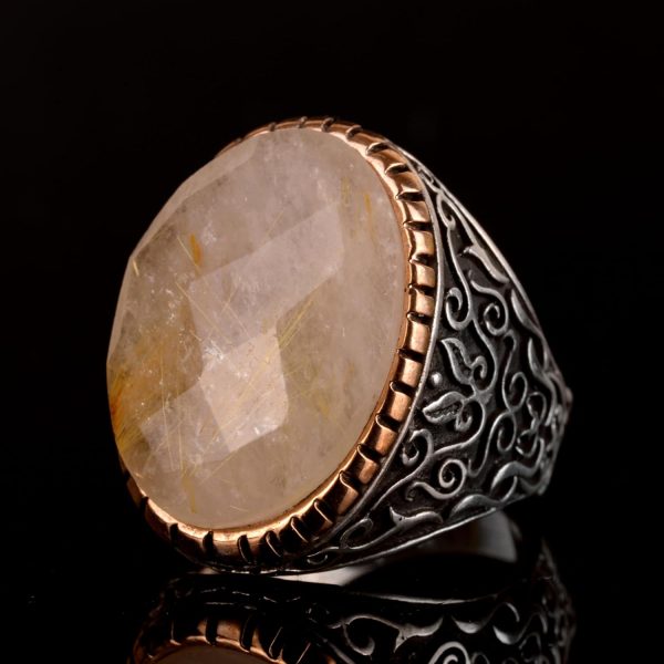 Gerçek Doğal Rutil Kuvars Taşı Erkek Yüzük, 925 Ayar Gümüş Yüzük, Altın Rutil Yüzük