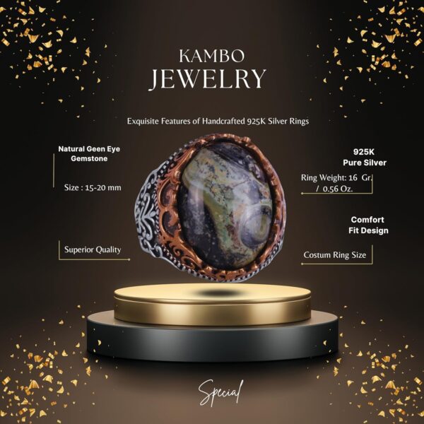 Bu muhteşem erkek yüzüğü, derin sembolizmi ve netlik ile içgörü ile bağlantılı büyüleyici deseniyle tanınan gerçek bir Yeşil Göz taşına sahiptir. El yapımı 925 ayar gümüş bir bant içinde yer alan Yeşil Göz taşı, sadece görsel olarak etkileyici değil, aynı zamanda güvenli ve şık bir şekilde monte edilmiştir.