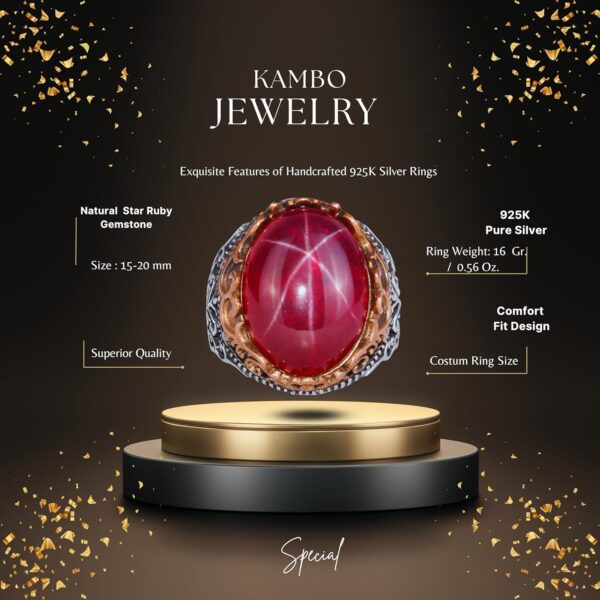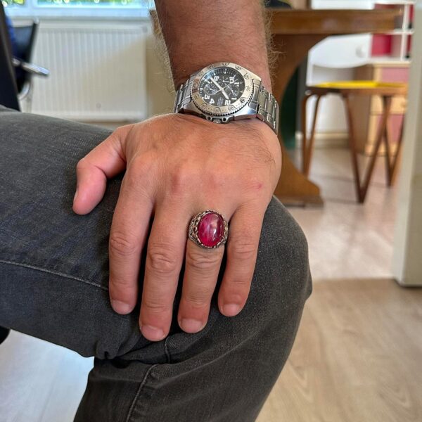 Bu el yapımı yüzük, 925 Ayar Gümüş üzerine yerleştirilmiş doğal bir Yıldız Yakutu taşını içermektedir. Dayanıklılığı ve büyüleyici, zarif kırmızı rengiyle mükemmel bir uyum sunar. Yıldız Yakutu’nun belirgin yıldız benzeri yansıması, bu parçaya ekstra bir benzersizlik ve güzellik katmaktadır. Her yüzük, kendine özgü tasarımıyla benzersizdir; karmaşık işçilik, onu gerçek bir ifade parçası haline getirir.