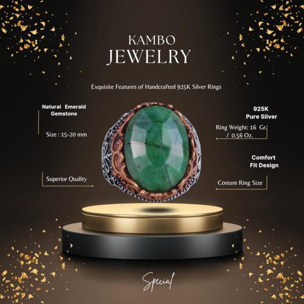 Bu el yapımı yüzük, 925 Ayar Gümüş içine yerleştirilmiş doğal Zümrüt taşına sahiptir. Dayanıklılığı ve büyüleyici, zarif bir yeşil rengi harmanlayarak sunar. Her yüzük benzersiz bir tasarıma sahiptir, bu da her parçanın farklı olmasını sağlar ve karmaşık işçiliği ile gerçek bir ifade parçası haline getirir.
