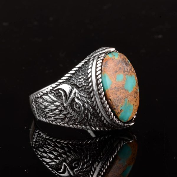 Gerçek Doğal Taş Erkek Yüzük, Kartal Yüzük, 925 Ayar Gümüş Yüzük (Turkuaz)