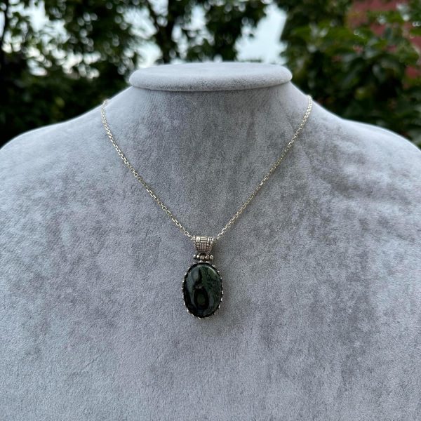 Bu muhteşem 925 ayar gümüş kolye ile doğal Yeşil Kedi Gözünün zarafetini deneyimleyin. Kolye ucu, benzersiz ışık yansıması ve büyüleyici yeşil tonlarıyla bilinen, güzelce parlatılmış gerçek bir Yeşil Kedi Gözlü taşı içermektedir. Doğal taşları sevenler için mükemmel olan bu kolye, her kıyafete eşsiz bir dokunuş katar.