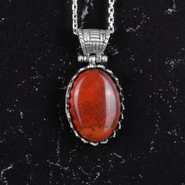 Bu göz alıcı 925 ayar gümüş kolye ile doğal Kırmızı Kan Taşı’nın zarafetini deneyimleyin. Kolye ucu, zengin kırmızı rengi ve eşsiz desenleri ile bilinen, güzel bir şekilde parlatılmış gerçek Kırmızı Kan Taşı taşını içermektedir. Doğal taşları sevenler için mükemmel olan bu kolye, her kıyafete eşsiz bir dokunuş katmaktadır.
