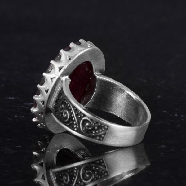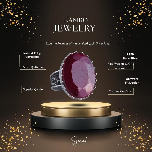 Bu eşsiz yüzük, yüksek kaliteli 925 ayar gümüşten yapılmıştır ve muhteşem bir doğal Ruby değerli taşına sahiptir. Yüzüğün karmaşık tasarımı, geleneğin ve modernliğin uyumlu bir birleşimini yansıtarak, her şık takı koleksiyonuna olağanüstü bir katkı sağlar.