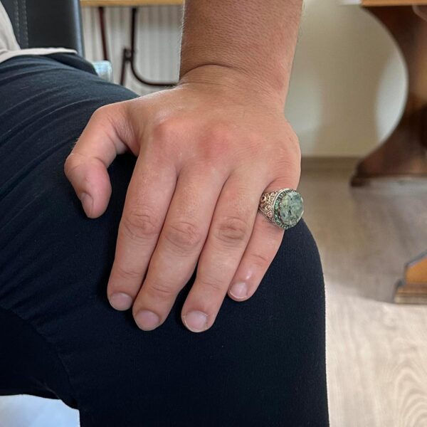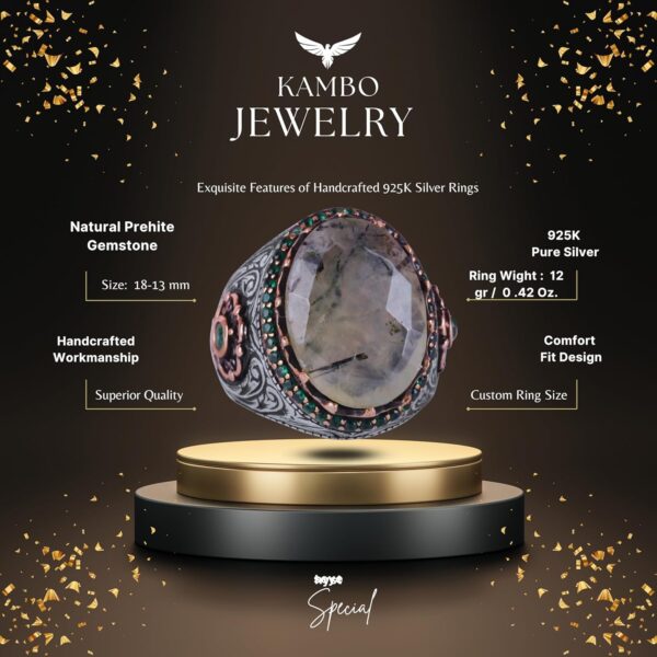 Özgün Tasarım: KAMBO, 925 ayar gümüş içinde yer alan gerçek doğal prehnit taşı ile süslenmiş etkileyici bir el yapımı yüzük sunuyor. Bu yüzük, zarif ve anlamlı takı parçalarını takdir edenler için mükemmeldir.