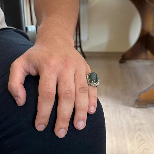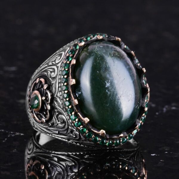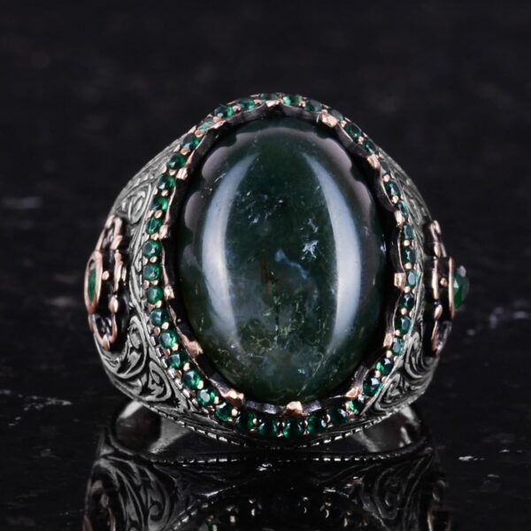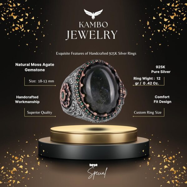 Özgün Tasarım: KAMBO, 925 ayar gümüş üzerine yerleştirilmiş gerçek doğal yosun akik taşı ile muhteşem bir el yapımı yüzük sunuyor. Bu yüzük, şık ve anlamlı takı parçalarını takdir edenler için mükemmel bir seçimdir.