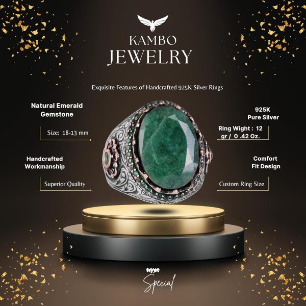 Özgün Tasarım: KAMBO, 925 ayar gümüş üzerine yerleştirilmiş gerçek doğal zümrüt taşından oluşan muhteşem bir el yapımı yüzük sunmaktadır. Bu yüzük, zarif ve anlamlı takı parçalarını takdir edenler için mükemmeldir.