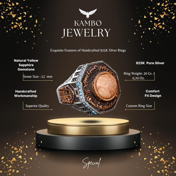 Bu el yapımı yüzük, 925 Ayar Gümüşten üretilmiştir ve canlı sarı rengi ile bilinen gerçek bir Sarı Safir taşına sahiptir. Yüzüğün tasarımı, İslam’ın en kutsal yerlerinden biri olan Al-Aqsa Camii’nin detaylı betimlemesiyle daha da zenginleştirilmiştir ve bu, inancını ve mirasını değerli bulanlar için anlamlı bir parça haline getirir.