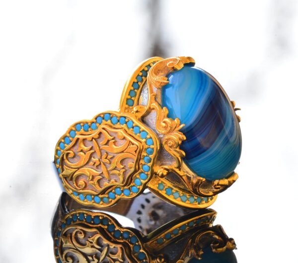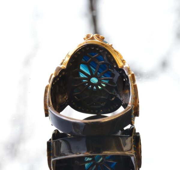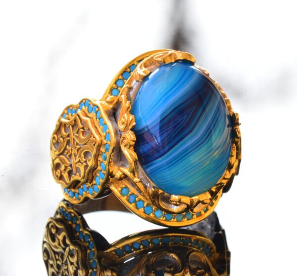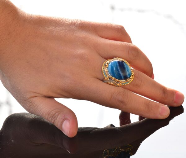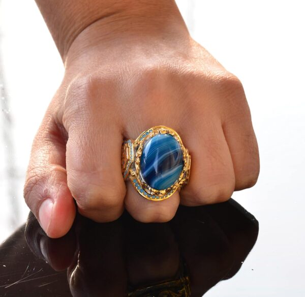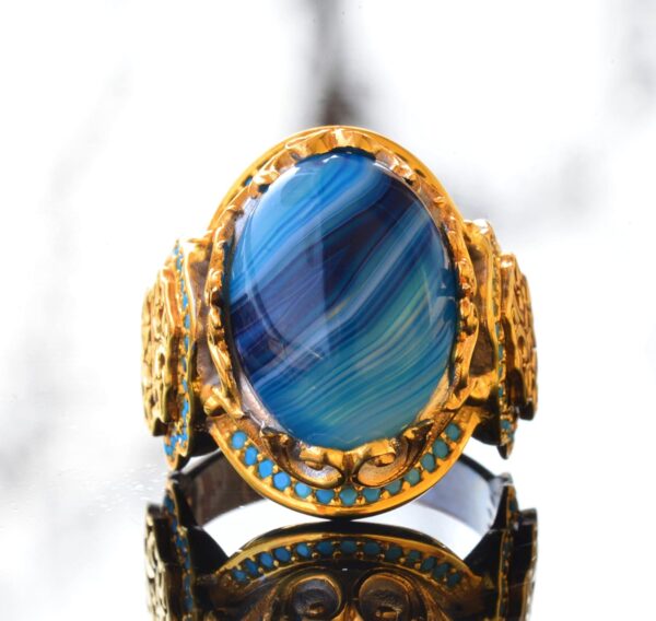Gerçek Doğal Taş Yüzük, 925 Ayar Gümüş Kral – Altın Kaplama (Mavi Akik)