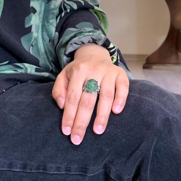 Bu muhteşem 925 ayar gümüş yüzük ile doğal Zümrüt’ün zarafetini deneyimleyin. Yüzük, zengin yeşil rengi ve benzersiz desenleriyle tanınan güzelce cilalanmış gerçek bir Zümrüt taşına sahiptir. Doğal taşlara değer verenler için mükemmel olan bu yüzük, karmaşık el yapımı tasarımıyla her kıyafete benzersiz bir dokunuş katmaktadır.