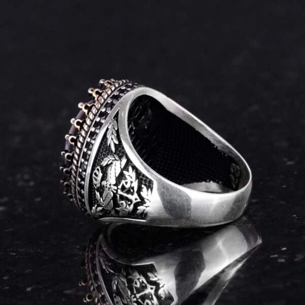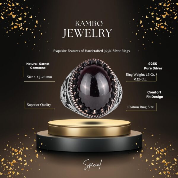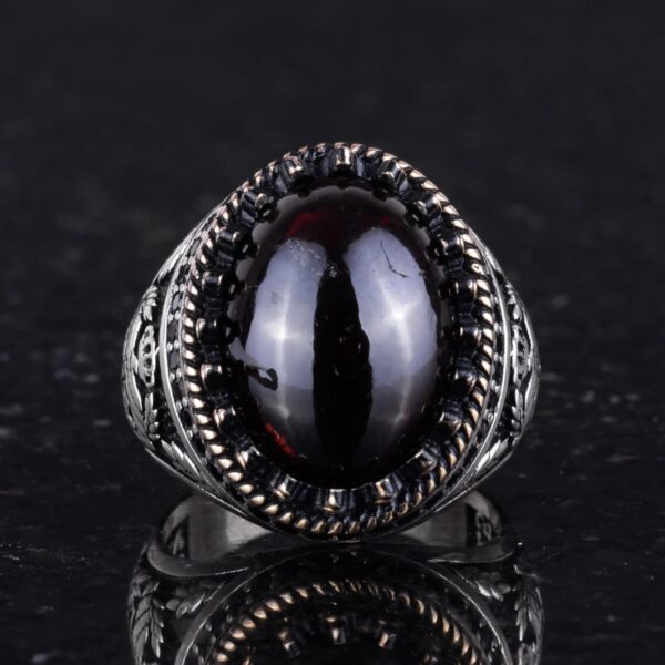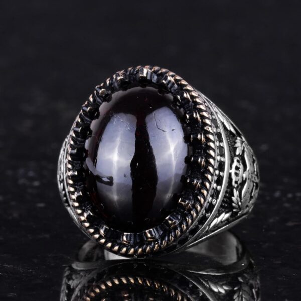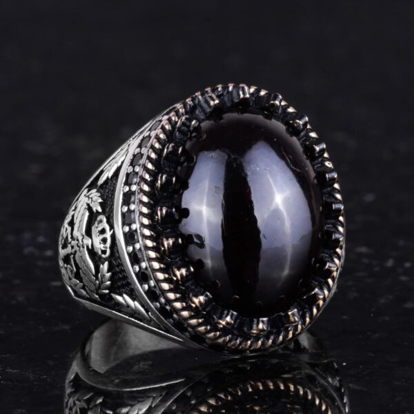 - Zamansız Tasarım: Granat taşının derin kırmızı tonu, karmaşık kartal tasarımı ile tamamlanarak benzersiz ve zarif bir görünüm sunar.