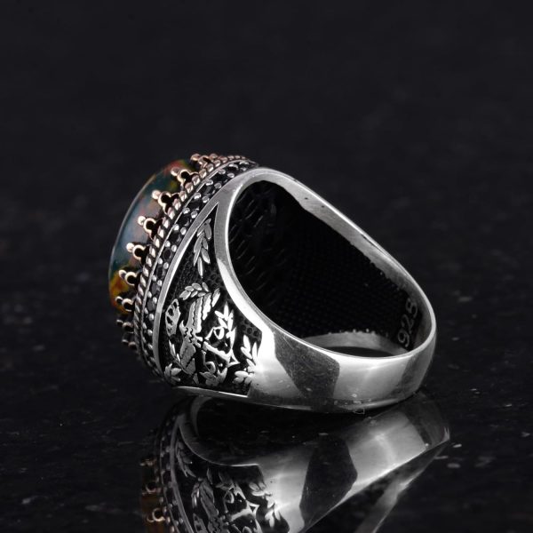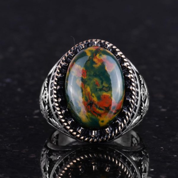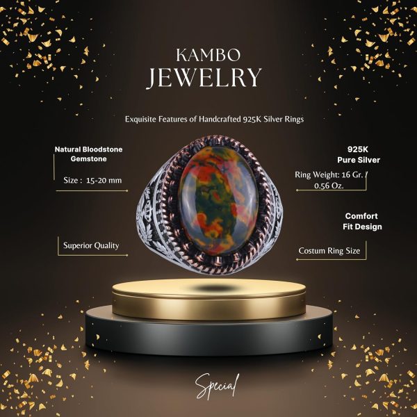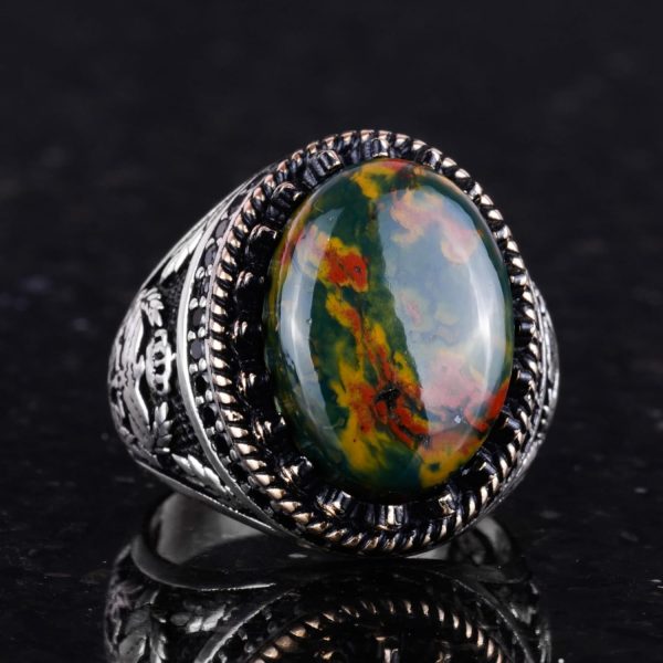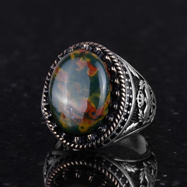 - Zamansız Tasarım: Yeşil Kan Taşı taşının zengin yeşil tonları ve belirgin kırmızı noktaları, karmaşık kartal tasarımı ile tamamlanarak benzersiz ve şık bir görünüm sunar.