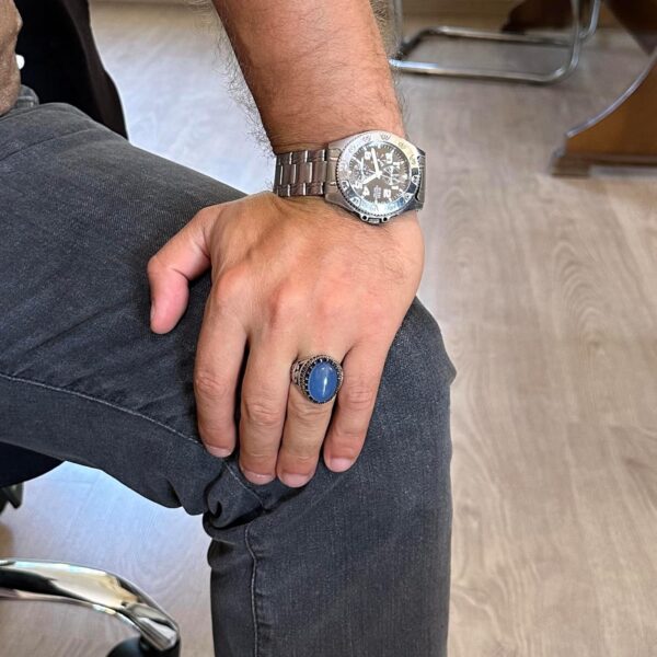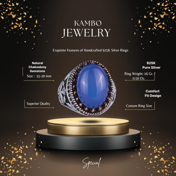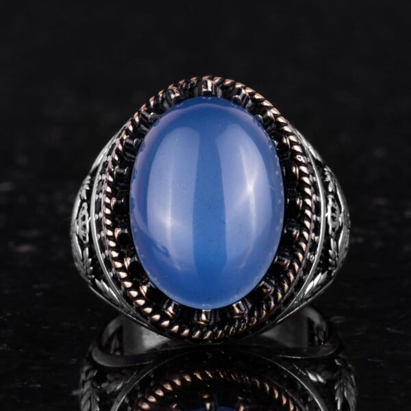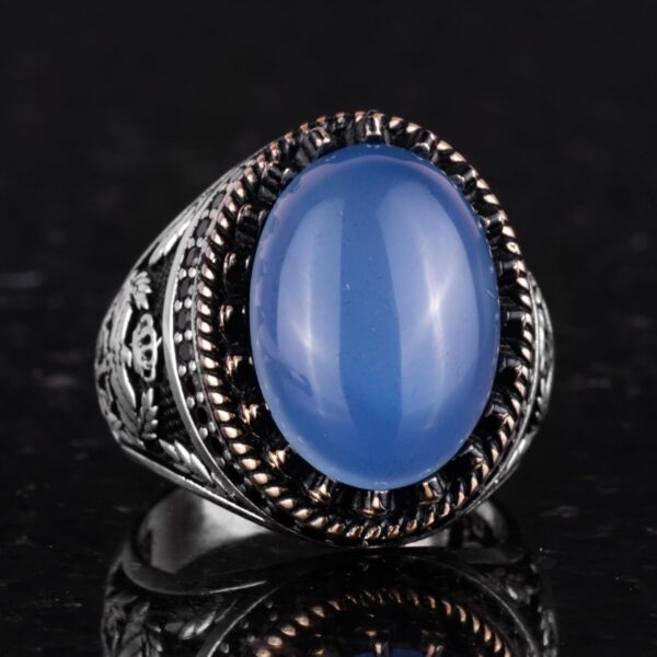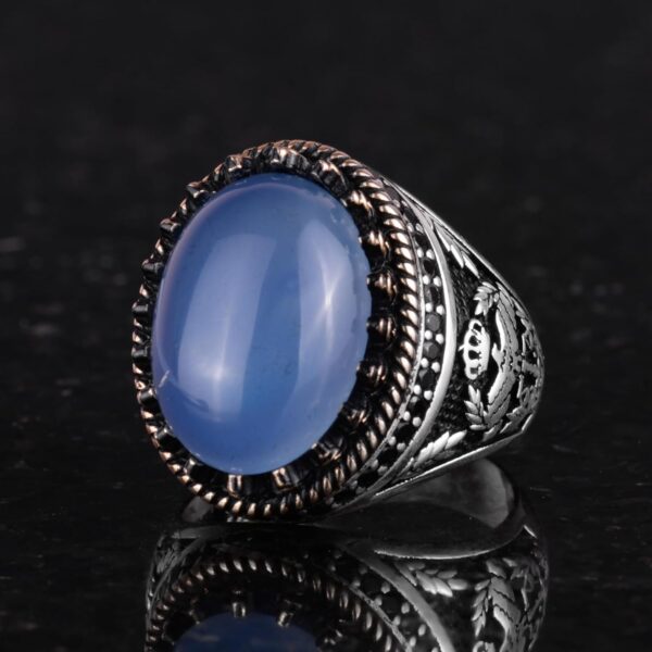 - Zamansız Tasarım: Chalcedony taşının sakin mavi tonu, karmaşık kartal tasarımı ile tamamlanarak benzersiz ve zarif bir görünüm sunar.