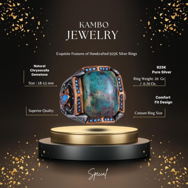 Her yüzük, yetenekli zanaatkarlar tarafından titizlikle yapılmakta olup, her parçanın eşsiz olmasını sağlamaktadır. Yüksek kaliteli 925 ayar gümüş, Chrysocolla taşı için dayanıklı ve lüks bir zemin sağlar ve bu yüzüğün yıllar boyunca koleksiyonunuzun değerli bir parçası olacağından emin olabilirsiniz. Anlamlı bir hediye arıyorsanız ya da kendiniz için cesur bir aksesuar istiyorsanız, bu Chrysocolla yüzüğü sizi etkileyecektir.