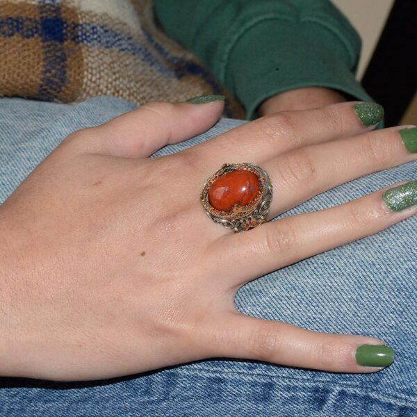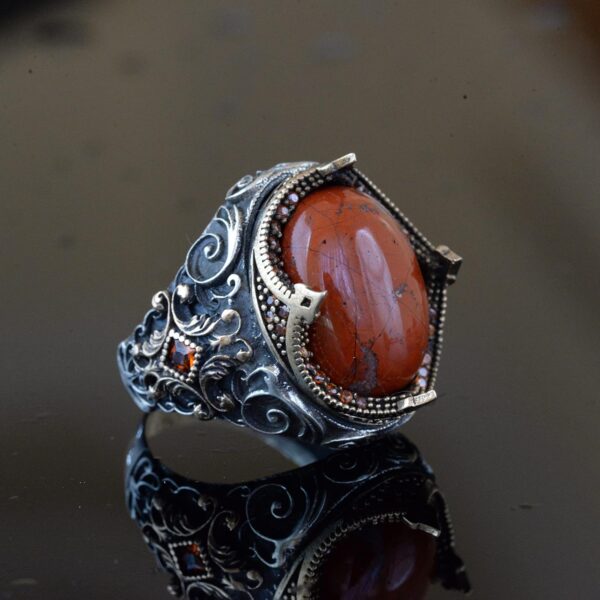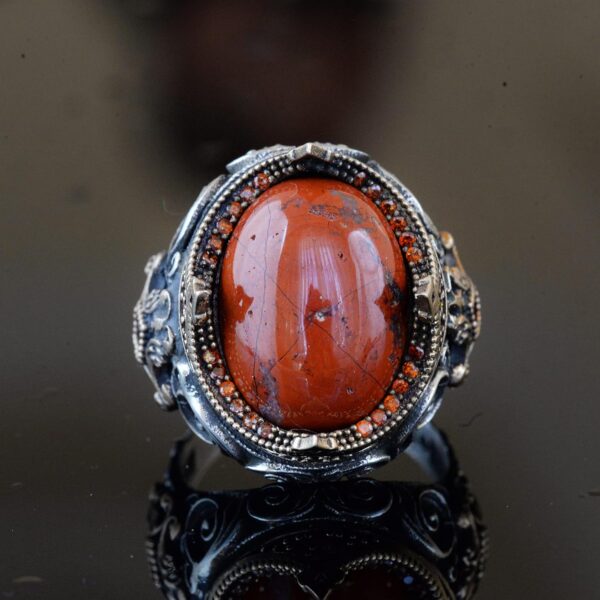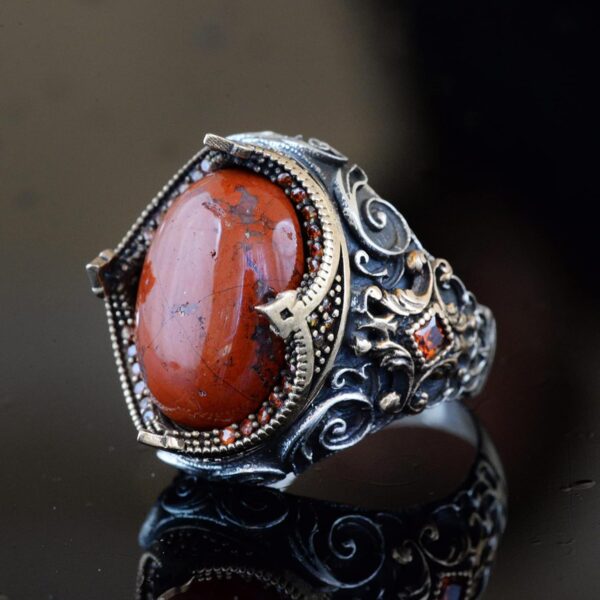 | Taş Tipi | Doğal Kantaşı Doğal Kantaşı, koyu zemin üzerinde kırmızı benekli yapısıyla dikkat çeken karakteristik bir görünüme sahiptir. Tarih boyunca cesaret ve canlılıkla ilişkilendirilmiş; güçlü kontrastları sayesinde etkileyici takı tasarımlarında öne çıkar. |