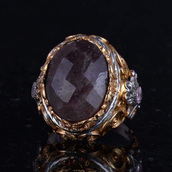 Bu muhteşem Sultan Yüzüğü, zarafet ve güç simgesidir. 925 ayar gümüşten el yapımı olarak üretilmiş ve altınla kaplanmıştır. Yüzük, derin kırmızı doğal safir taşını barındırarak her kıyafete kraliyet havası katmaktadır.