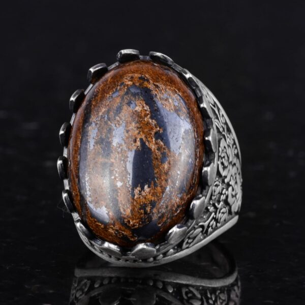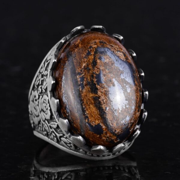 Gerçek Doğal Bronzit Taşlı Yüzük – 925 Ayar Gümüş El Yapımı Gül Desenli Yüzük
