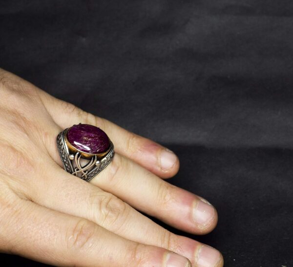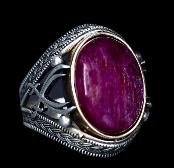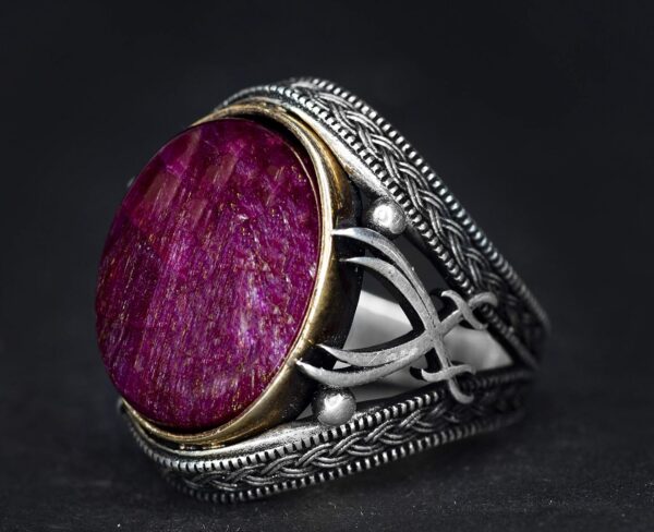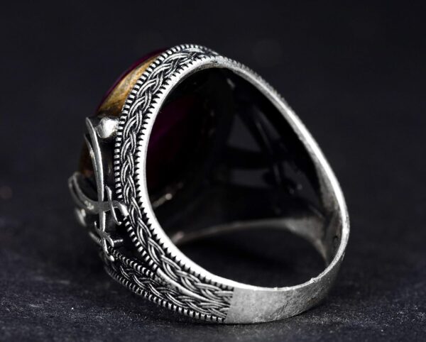 Pürüzsüz cabochon yakut, detaylı gümüş işçiliği ile mükemmel bir şekilde tamamlanarak lüks ve zarafet katıyor. Bu yüzük yalnızca bir aksesuar değil, aynı zamanda kaliteli işçiliği ve anlamlı tasarımı takdir eden erkekler için ideal bir ifade parçasıdır.