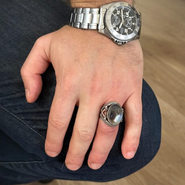Taş, kaliteli gümüş bir bant üzerine yerleştirilmiştir ve bant, kılıç motifiyle özenle tasarlanmıştır. Cesareti ve onuru simgeleyen kılıç, deneyimli zanaatkarlar tarafından dikkatlice el yapımı olarak üretilmiştir ve her yüzüğün benzersiz ve olağanüstü kalitede olmasını sağlamaktadır.