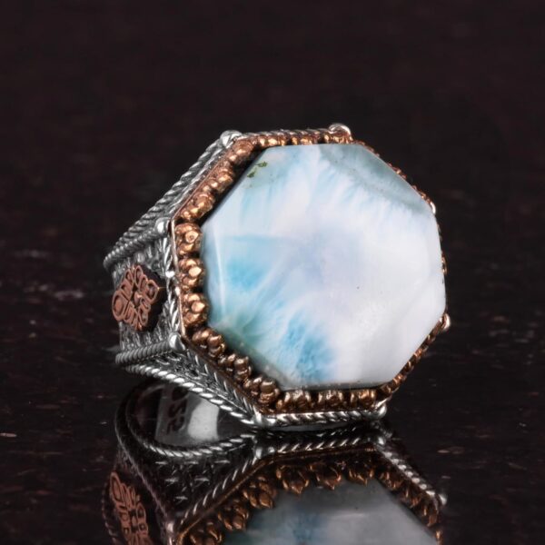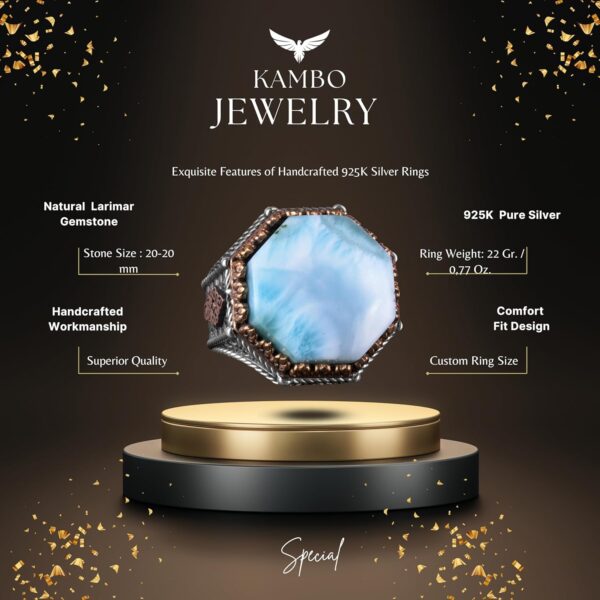- Eşsiz Sekizgen Tasarım: Bu el yapımı yüzük, 925 ayar gümüş içine yerleştirilmiş muhteşem bir sekizgen şekline sahip gerçek larimar taşını içermektedir ve eşsiz bir takı parçası sunmaktadır.