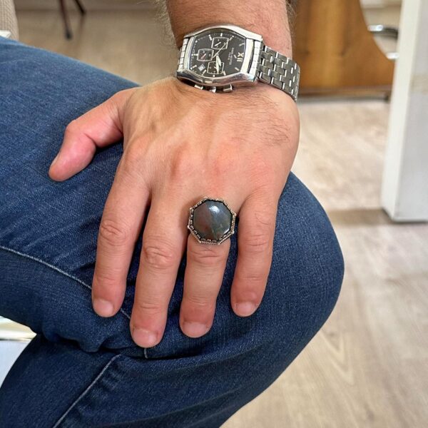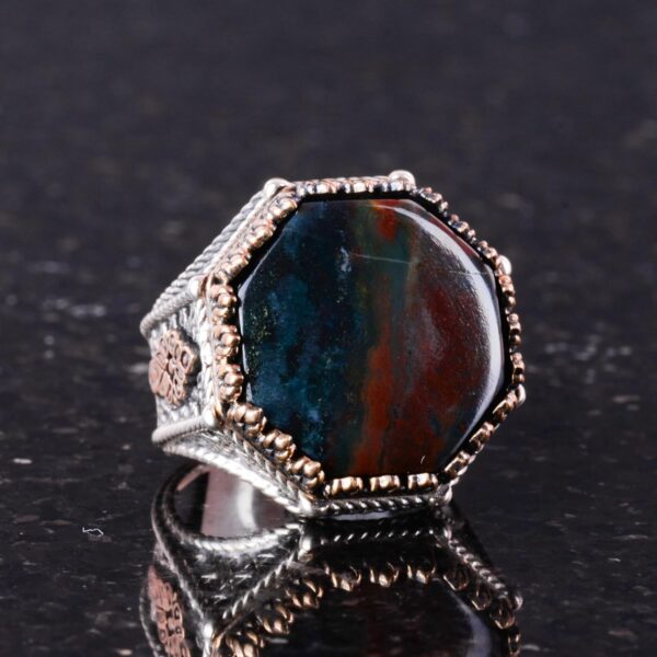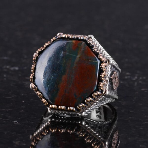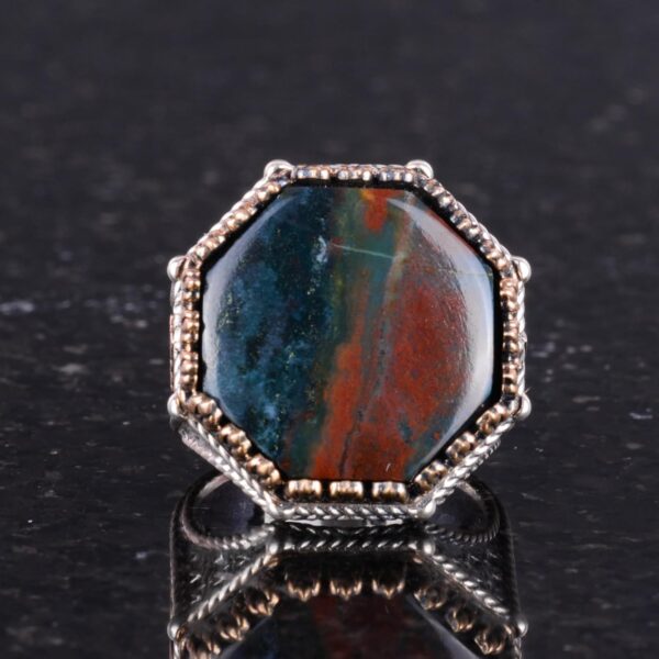 Gerçek Doğal Taş Yüzük – Sekizgen Tasarım – El Yapımı 925 Ayar Gümüş Takı (Yeşil Kan Taşı)
