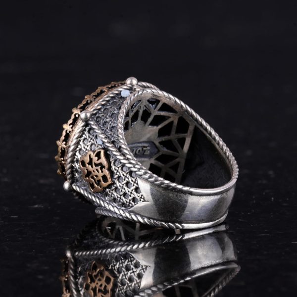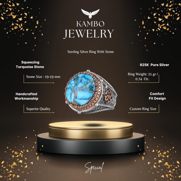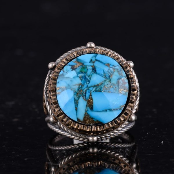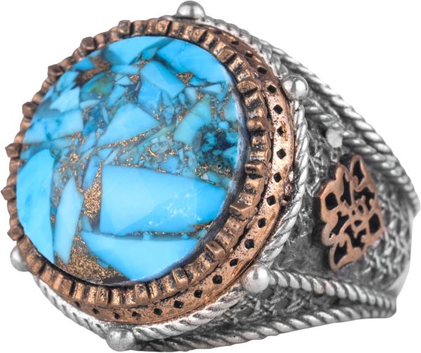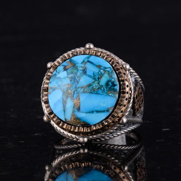 Gerçek Doğal Turkuaz Taşı ile Üretilmiş Gümüş Erkek Yüzük, Ayrıntılı Bronz Kaplama Aksamlar