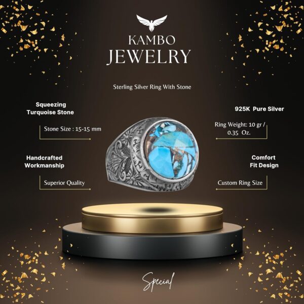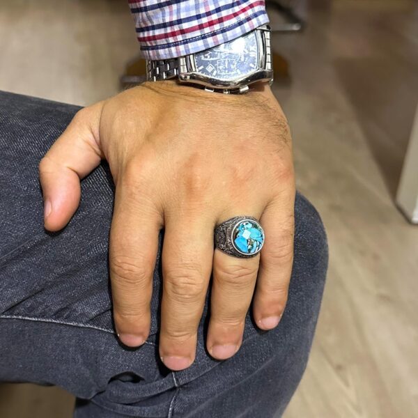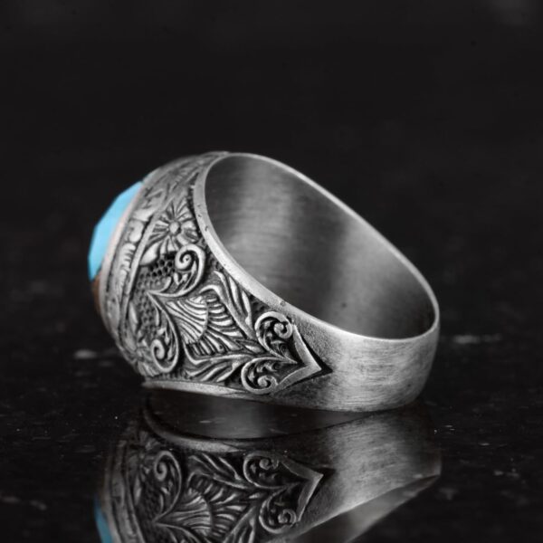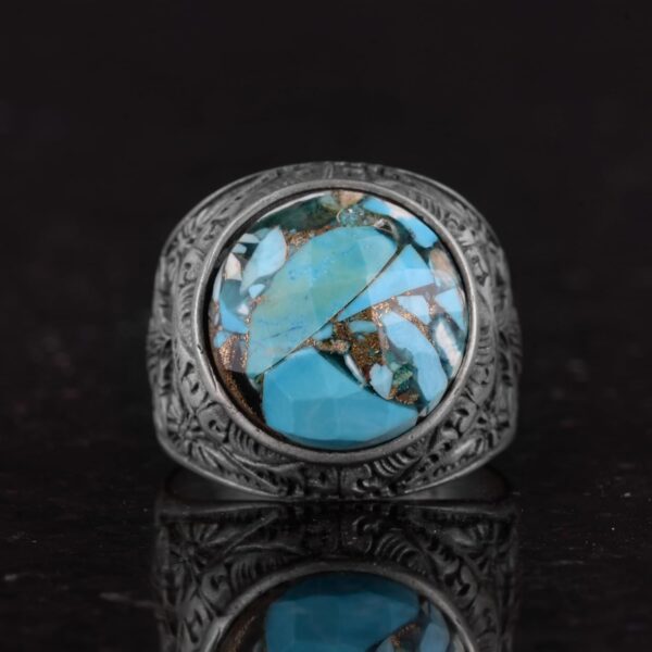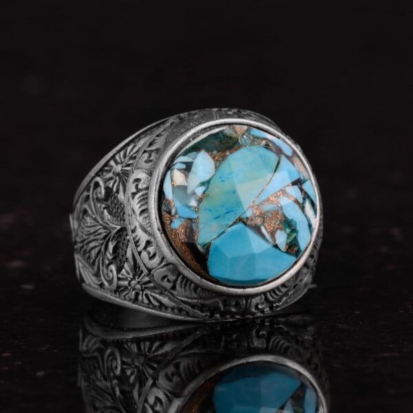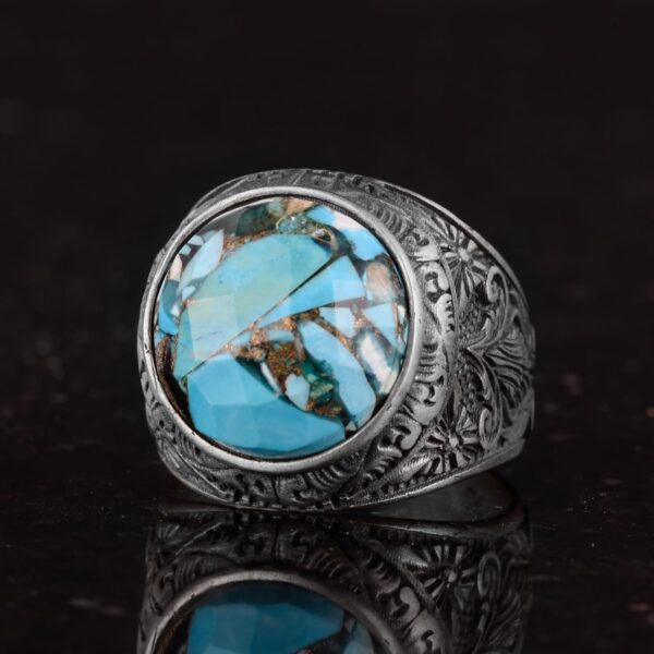 Gerçek Doğal Turkuaz Taşlı, Ayrıntılı Çiçek Tasarımlı Gümüş Erkek Yüzük