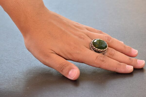 Bu eşsiz takı parçasıyla dikkat çekin. Doğal taşların güzelliği ve anlamını takdir eden erkekler için ideal bir hediye, doğum günleri, yıldönümleri veya diğer özel günler için mükemmeldir. Bu muhteşem yeşil jade taşı yüzüğüyle takı koleksiyonunuzu yükseltin.