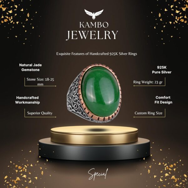 RUH SALGININI DESTEKLEYİN Jade, ruhsallık için mükemmel bir taş olarak kabul edilir. Bu taşın iç huzuru teşvik ettiğine ve sezgiyi güçlendirdiğine inanılır. KAMBO Özel Koleksiyonu, geniş bir doğal taş yelpazesi ile zenginleştirilmiş 925K Saf Gümüş Erkek Yüzüklerimizin benzersiz zarafetini keşfetmeye davet ediyor. Koleksiyonumuzdaki her doğal taş, benzersiz güzelliği ve getirdiği özel enerji için seçilmiştir. El yapımı yüzüklerimiz, lüks ve kişisel ifadenin özünü yansıtan zarif işçiliğin bir kanıtıdır. KAMBO, yüzüğünüzü tam boyutunuza ve tercihinize göre özelleştirme seçeneği ile zarif mücevher dünyasına samimi bir yolculuk sunar. Yüzük Ağırlığı: 23gr Taş Boyutu: 18-25mm