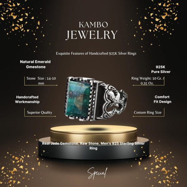 Yüzük, canlı yeşil rengi ve canlandırıcı özellikleriyle ünlü doğal bir dikdörtgen zümrüt taşına sahiptir. Her yüzük, zümrütün güzelliğini sergilemek için özenle tasarlanmıştır ve herhangi bir koleksiyonda dikkat çekici bir parça olmasını sağlar.