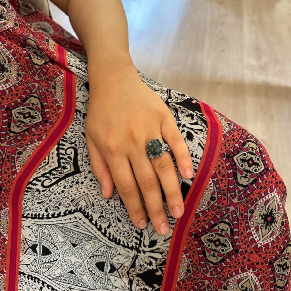 Bu muhteşem kadın yüzüğü, ustaca işlenmiş 925 ayar gümüş bir bant üzerinde yer alan etkileyici bir doğal zümrüt taşı sergilemektedir. Zümrütün derin yeşil tonları, karmaşık bohem esintili tasarım ile tamamlanarak hem zarif hem de eşsiz bir parça ortaya çıkarmaktadır.