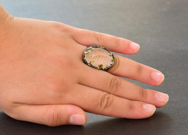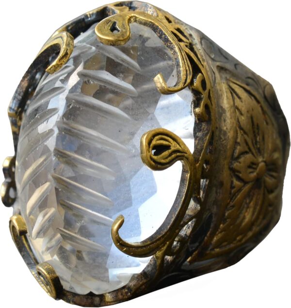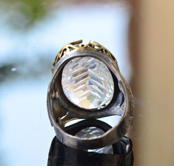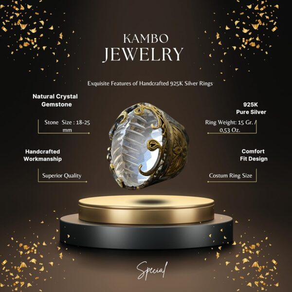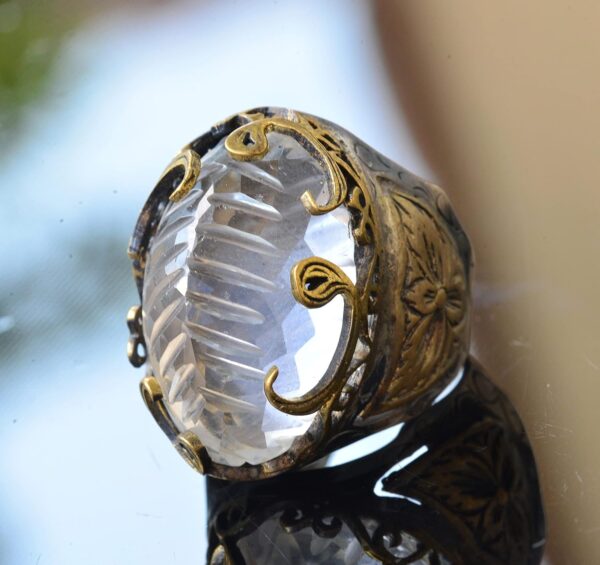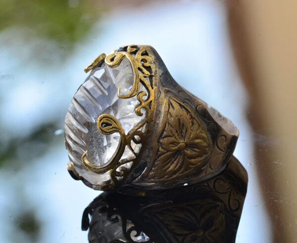 Yüzük, berraklığı ve şifa özellikleriyle bilinen gerçek bir kristal taşına sahiptir. Her yüzük, kültürel ve estetik değeri artıran geleneksel desenlerle özenle tasarlanmıştır.