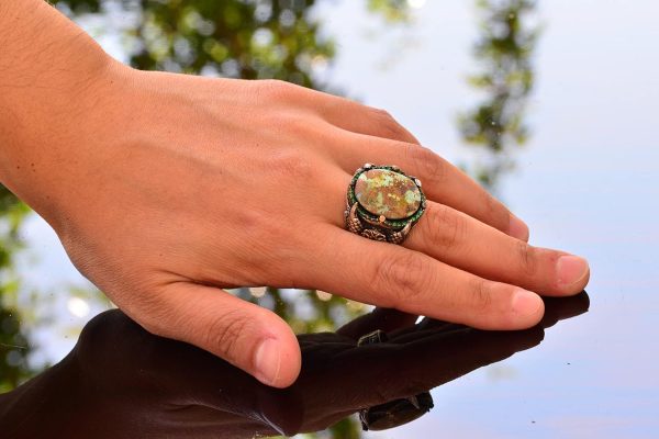 Yüzük, denge, huzur ve dayanıklılığı temsil eden güzel bir doğal turkuaz taşı sergilemektedir. Bu tasarım unsuru, yüzüğün görsel çekiciliğini artırmakla kalmaz, aynı zamanda taşla ilişkili olumlu özelliklerin sürekli bir hatırlatıcısı görevi görür.