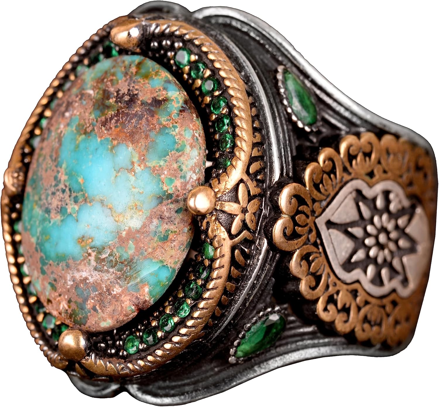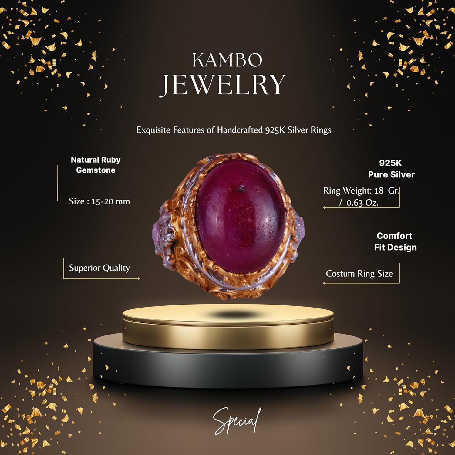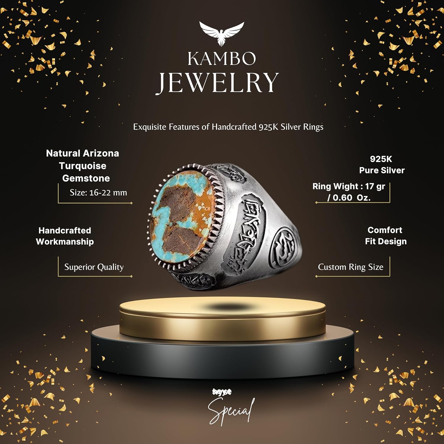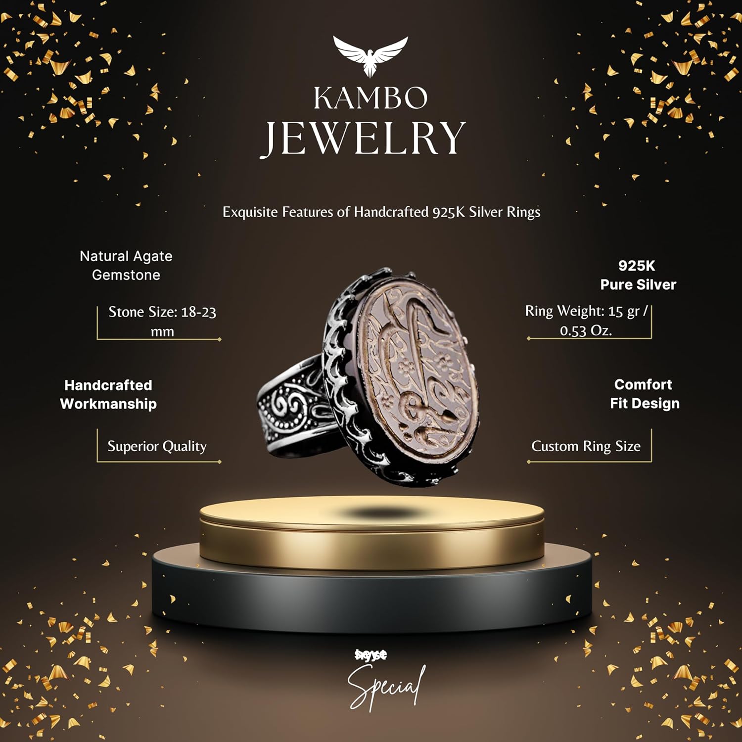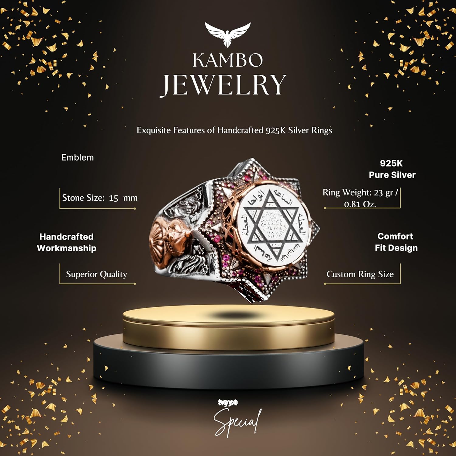 Bu yüzük, detaylarıyla dikkat çeken İslami tasarımı ile kültürel ve manevi bir anlam taşıyor. Usta işçilikle oluşturulan detaylar, yüzüğün zarafetini artırarak herhangi bir takı koleksiyonunda öne çıkmasını sağlıyor.