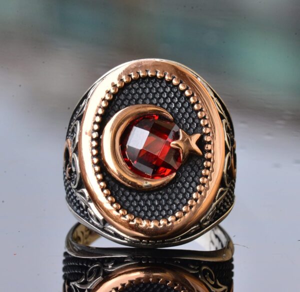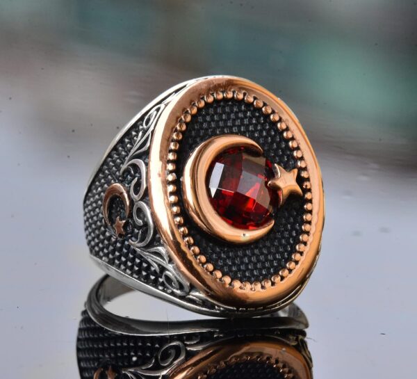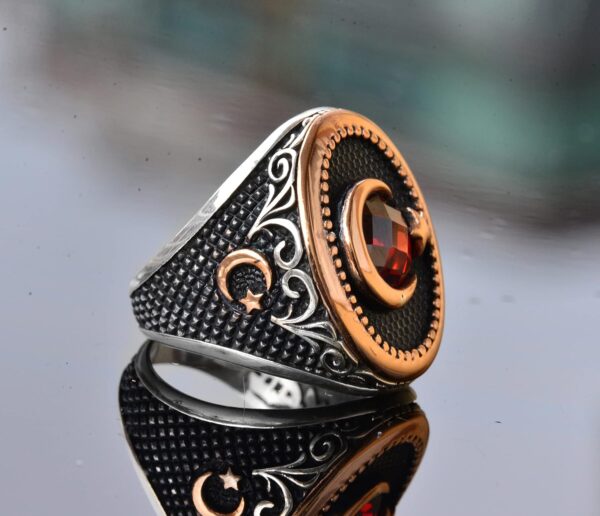 Hilal Yıldız Yüzük, Ay ve Yıldız Yüzüğü, Kırmızı Taşlı Erkek Gümüş Yüzük, 925 Ayar Gümüş Yüzük