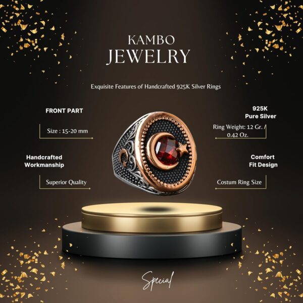 KAMBO Hilal Yıldız Yüzük – Bu güzel tasarıma sahip yüzükle stilinizi yükseltin. Hilal ay ve yıldız figürleri, büyümeyi ve rehberliği simgeler. Ortadaki kırmızı taş, çarpıcı bir kontrast oluşturarak bu yüzüğü her türlü etkinlik için göz alıcı bir aksesuar haline getirir.