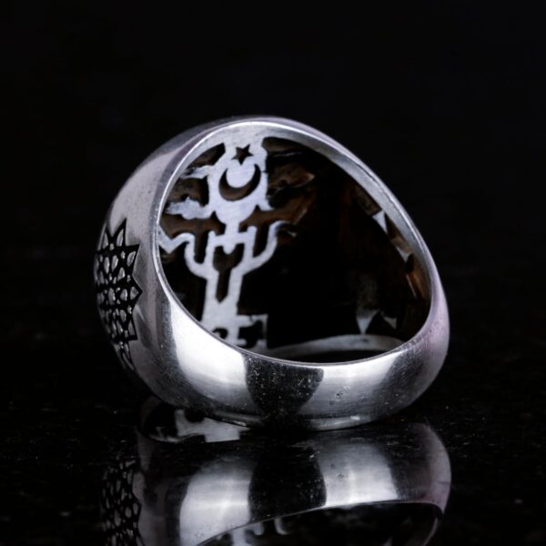 Detaylı İslami ve Arap sembolleriyle dolu bu yüzük, yalnızca bir takı parçası değil; aynı zamanda inancın ve kültürel köklerle derin bir bağlantının temsilcisidir.