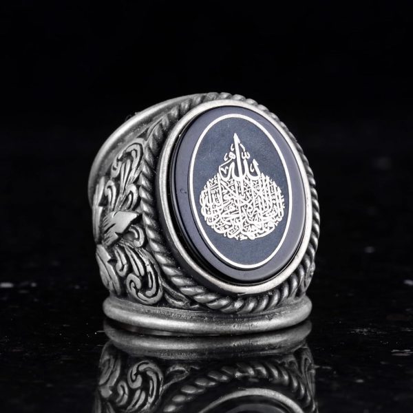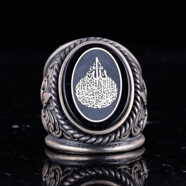 İslami Erkek Yüzüğü, Hat Sanatı Tasarımı, Oniks Taşlı Sterlin Gümüş Dinî Yüzük