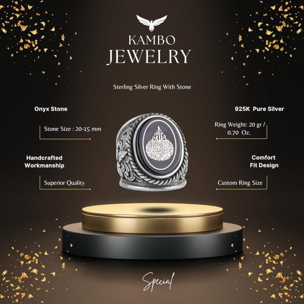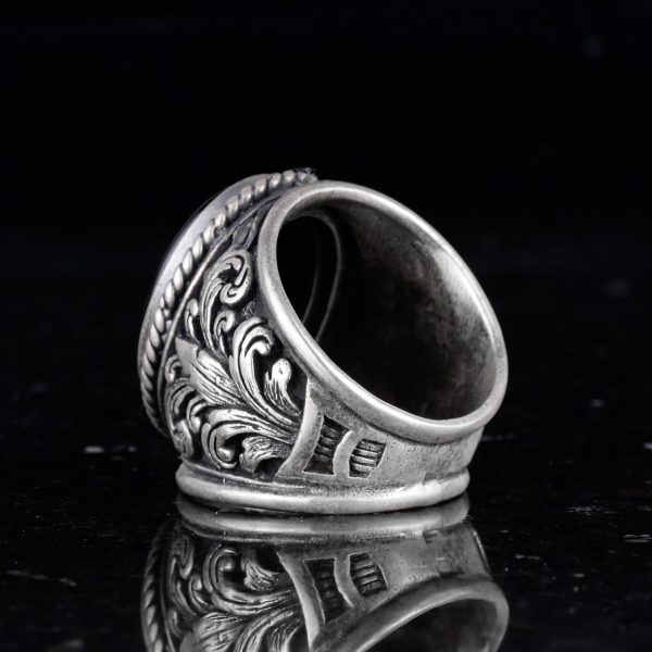 Bu benzersiz erkek yüzüğü, oval bir yüzeye işlenmiş güzel bir şekilde detaylandırılmış Arap hat sanatı tasarımı ile dikkat çekiyor ve İslam inancının güçlü bir temsilini oluşturuyor. Bant, yüksek kaliteli gümüşten yapılmış olup, ona hem antika hem de zamansız bir çekicilik kazandırıyor.