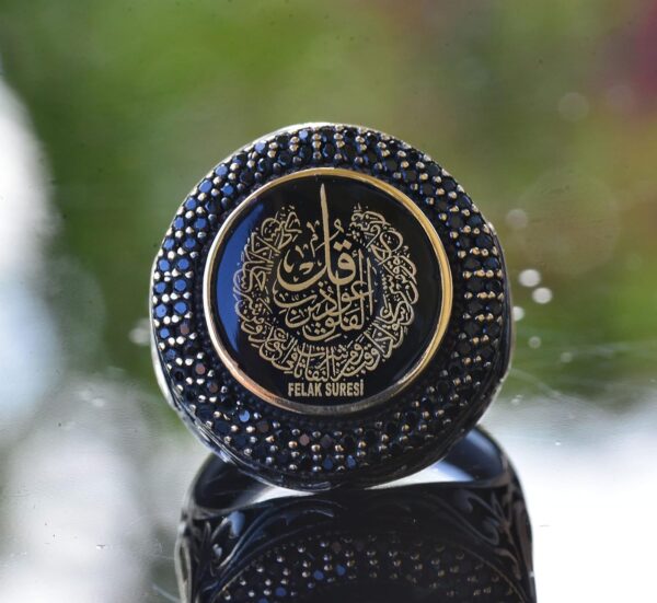 Yüzük, inancı, gücü ve korumayı temsil eden güçlü Felak Suresi’ni sergilemektedir. Bu tasarım unsuru, yüzüğün görsel çekiciliğini artırmakla kalmaz, aynı zamanda kişinin ruhsal yolculuğunu ve inançlarını sürekli hatırlatan bir öğe olarak da hizmet eder.