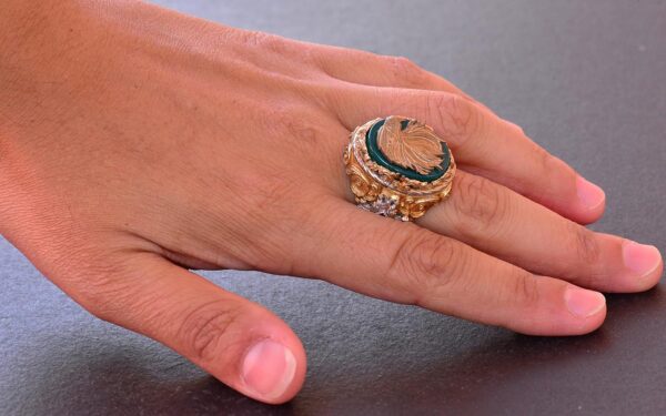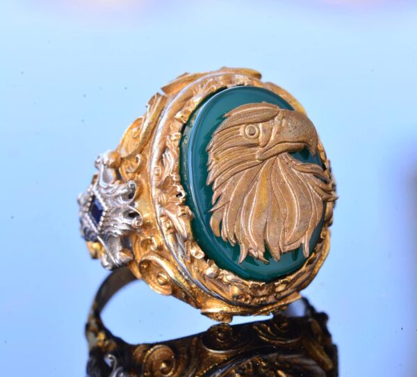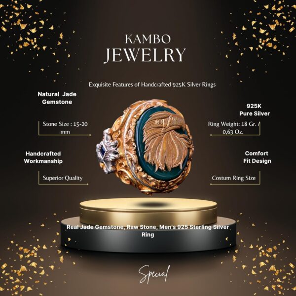 Yüzük, zengin yeşil jade taşı ile süslenmiştir; bu da ayrıntılı altın kaplama tasarımına çarpıcı bir kontrast ekleyerek yüzüğün görkemli ve ihtişamlı estetiğini artırmaktadır. Titizlikle el yapımı olan bu yüzük, sadece bir takı parçası değil, aynı zamanda güç ve vizyonun bir temsilidir.