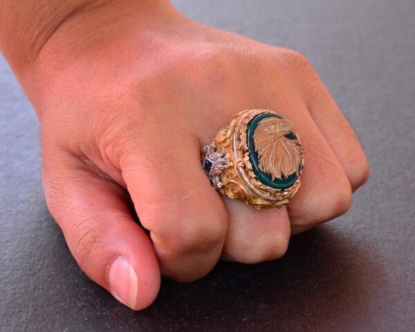 Altın Kaplama ve Yeşil Jade Taşı ile 925 Ayar Gümüş Kartal Yüzük – Erkekler için Görkemli Sembol Takı