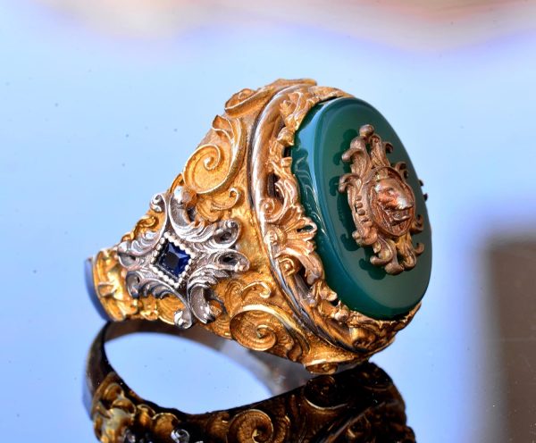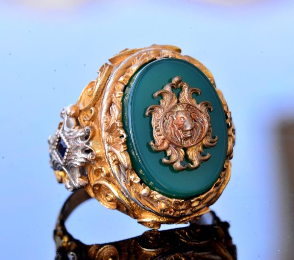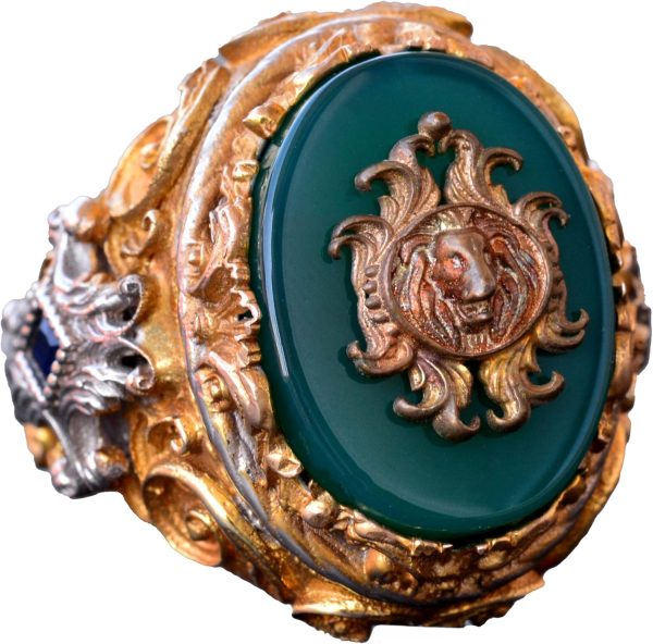 Yüzük, cesaret, güç ve liderliği simgeleyen özenle detaylandırılmış bir aslan tasarımına sahiptir. Bu nitelikler, koruyucu ve iyileştirici özellikleri ile bilinen doğal jade taşının eklenmesiyle daha da güçlenir.