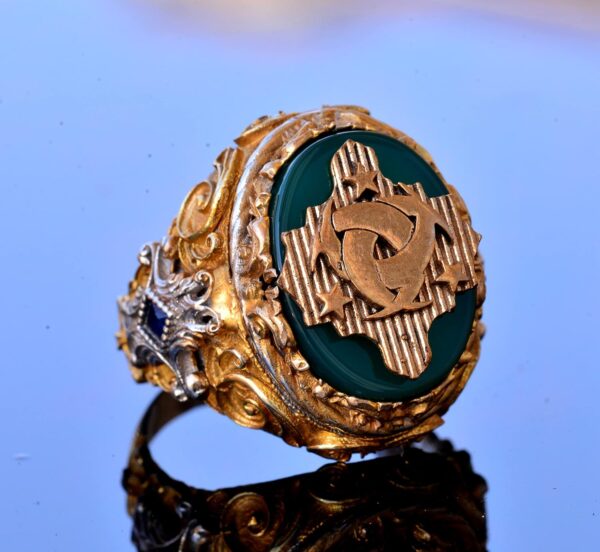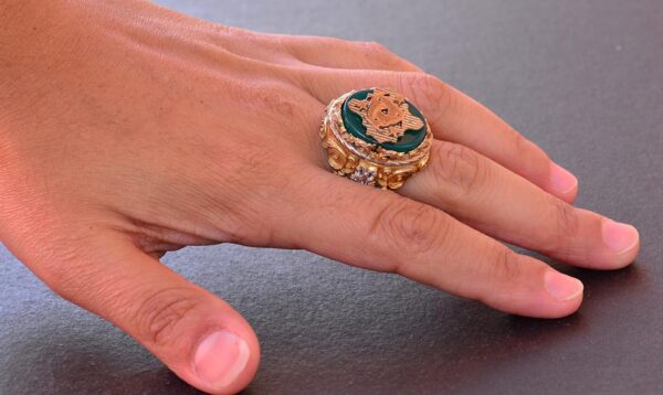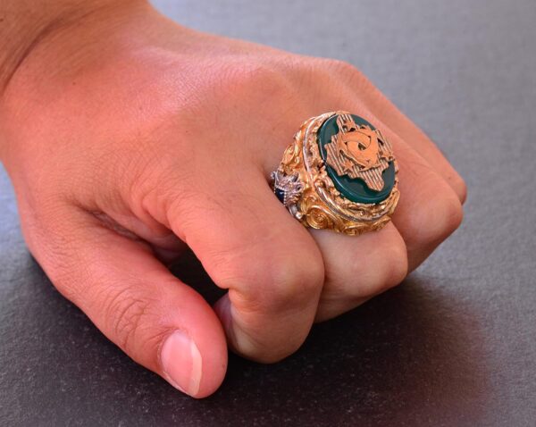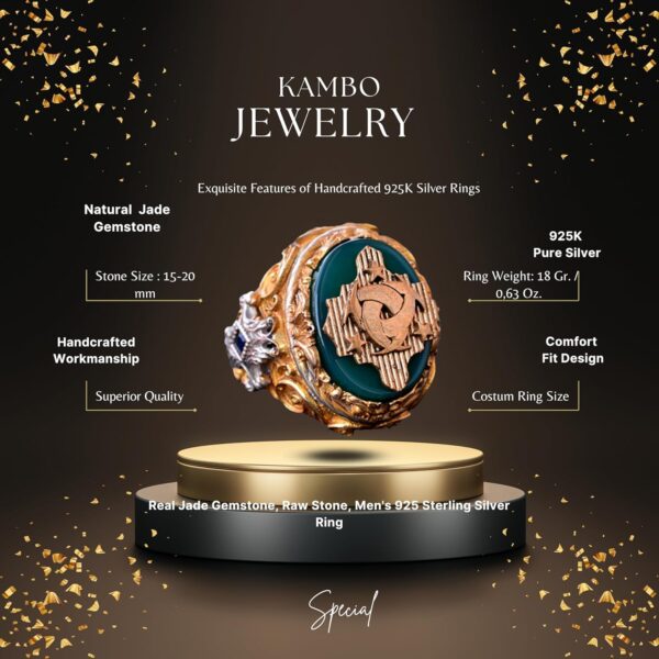 Yüzük, karmaşık tasarıma çarpıcı bir kontrast katan zengin yeşil jade taşı ile süslenmiştir ve bu da yüzüğün cesur ve etkileyici estetiğini artırır. Titizlikle el yapımı olan bu yüzük, sadece bir takı parçası değil, aynı zamanda gelenek ve gücün bir temsilidir.