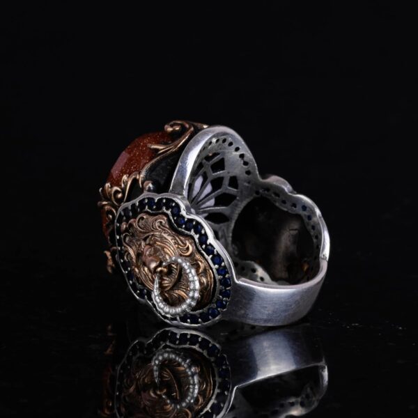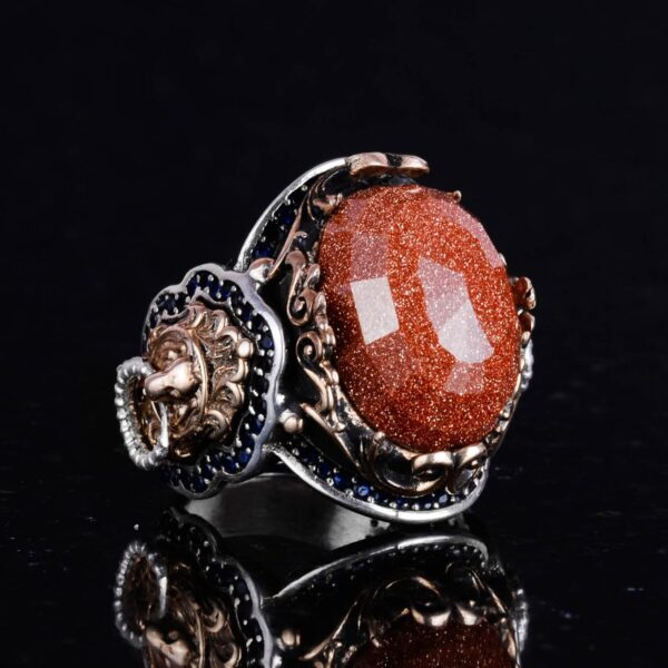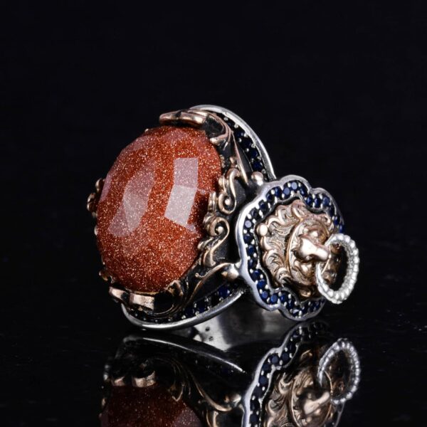 Kahverengi Güneş Taşı Yapay Taş Yüzük, 925K Gümüş Erkek Yüzük, Aslan Sembol Yüzüğü, Gümüş Modaya Uygun Erkek Yüzük