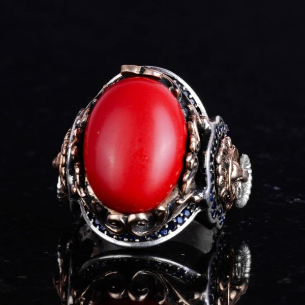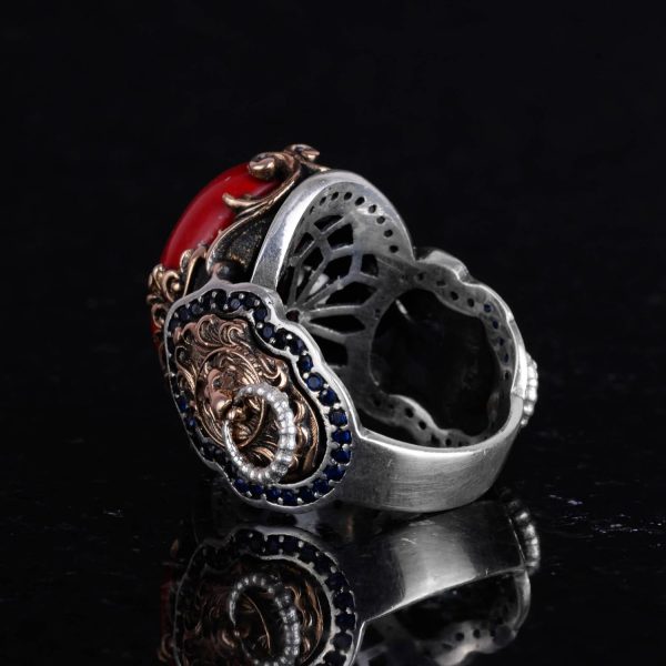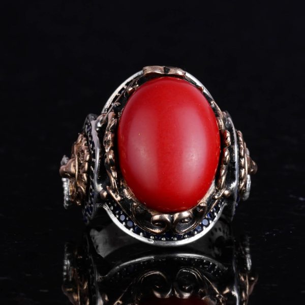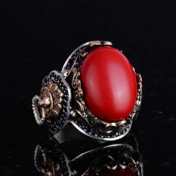 Kırmızı Mercan Taşı Yüzük, 925 Ayar Gümüş Erkek Yüzüğü, Aslan Sembolü Yüzüğü, Hayvan Gümüş Yüzüğü