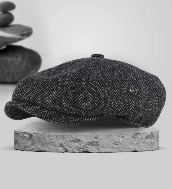 Koyu Gri Siyah Çizgili Yünlü Kaşe Kışlık Kumaş Kasket Şapka (Terletmez Saten Astar)