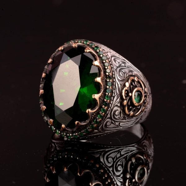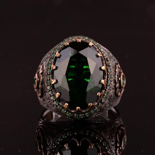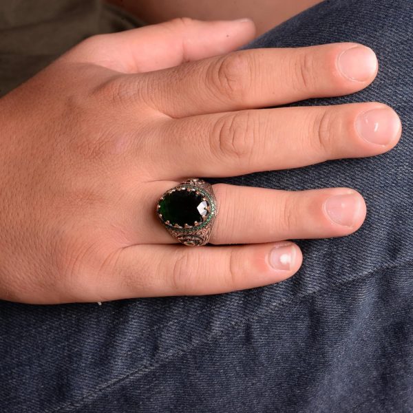 Kral Yüzük, Yaşlandırma Yüzüğü, Sultan Yüzüğü, Erkek 925 Ayar Gümüş Yüzük, Yapay Zümrüt Taşı, yeşil